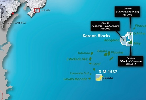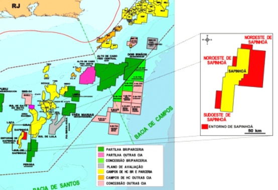 A anp aprovou a postergação do prazo da declaração de comercialidade do plano de avaliação da descoberta pad do poço 1 dev 15 ess itaipu nos blocos c m 61 e c m 101 na bacia de campos. Informamos que apresentamos hoje em nome do consórcio de libra à agência nacional de petróleo gás natural e biocombustíveis anp a declaração de comercialidade da acumulação de petróleo localizada na porção noroeste do bloco de libra no pré sal da bacia de santos. Juntamente com as declarações de comercialidade os consórcios submeteram à anp o relatório final do plano de avaliação de áreas. Mapa de localização do campo de sapinhoá fonte.